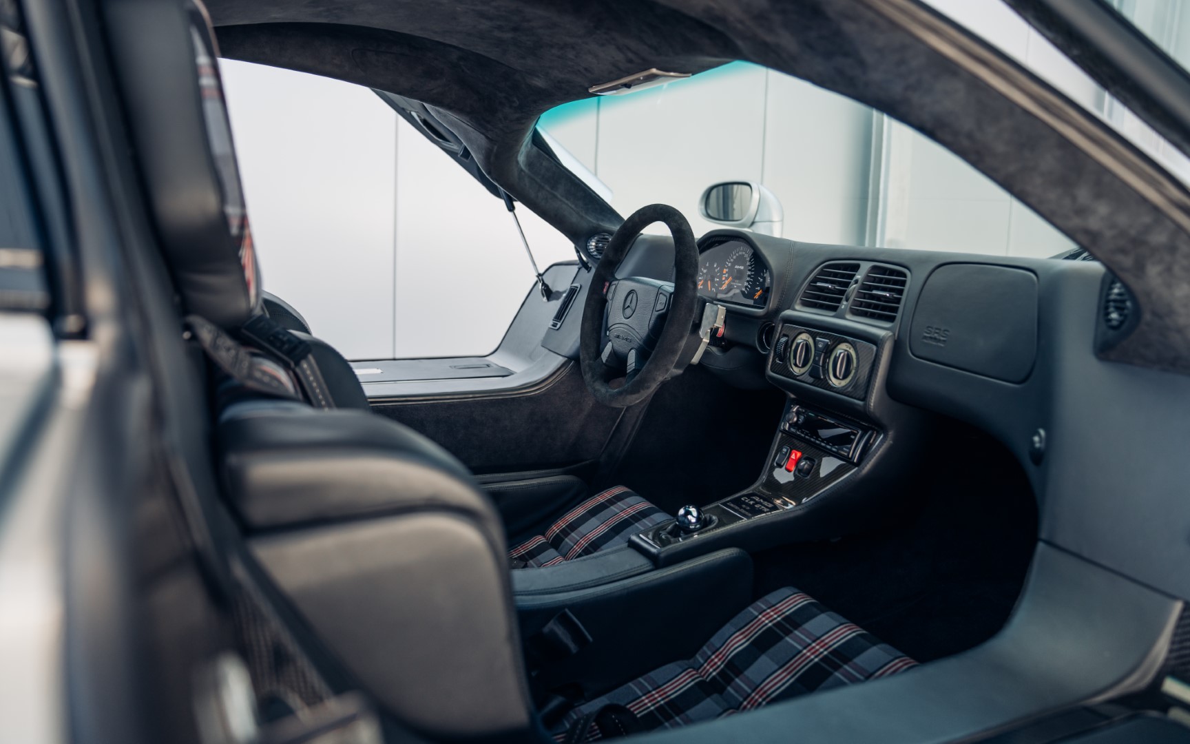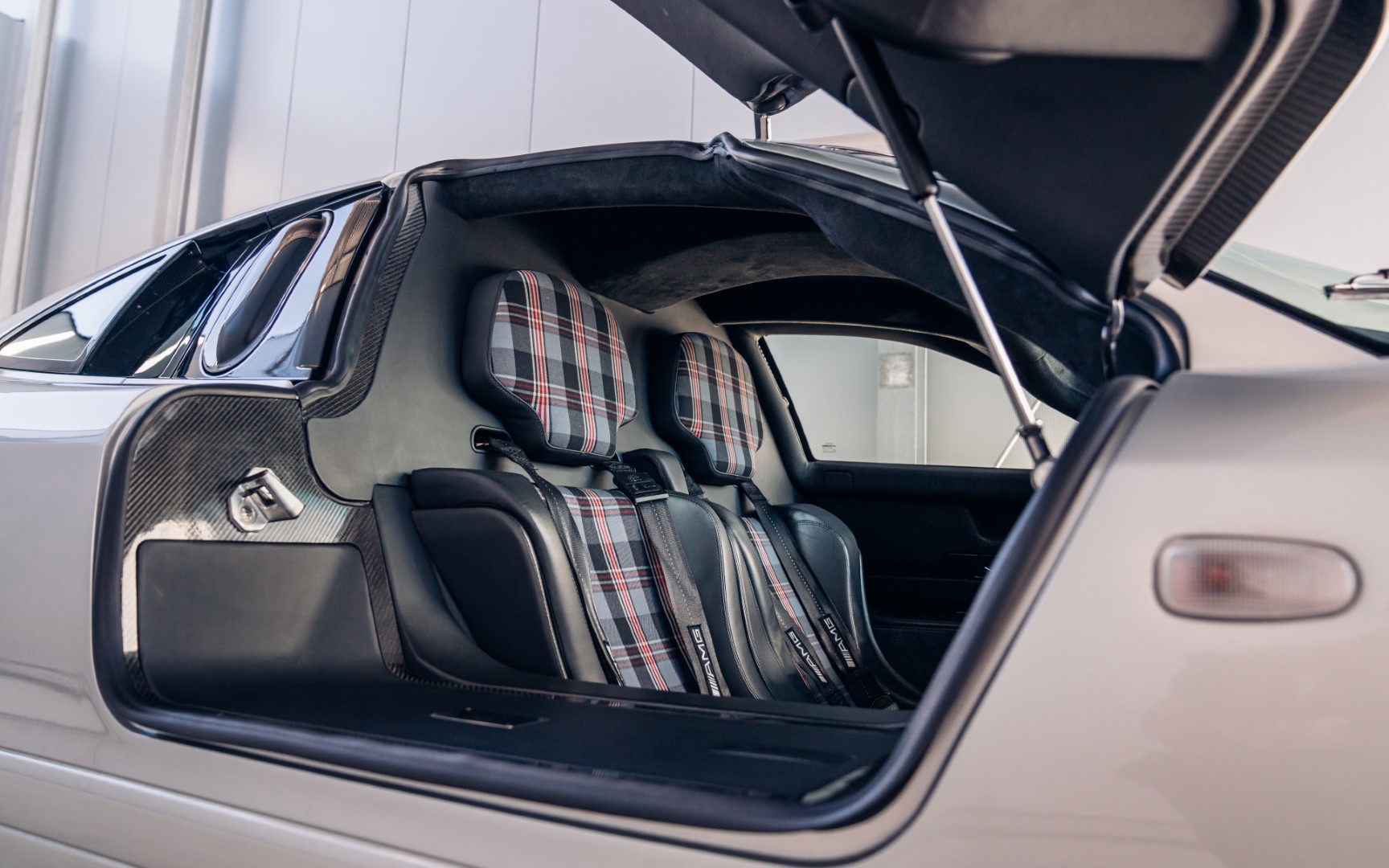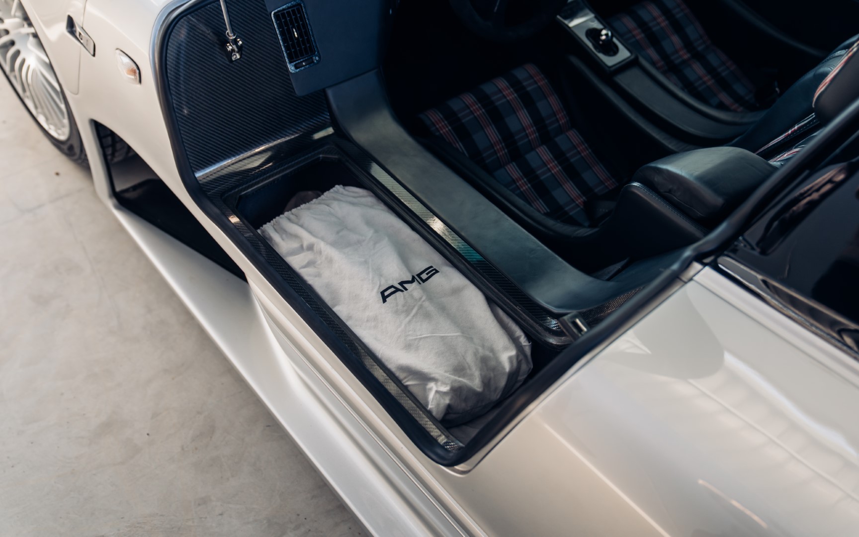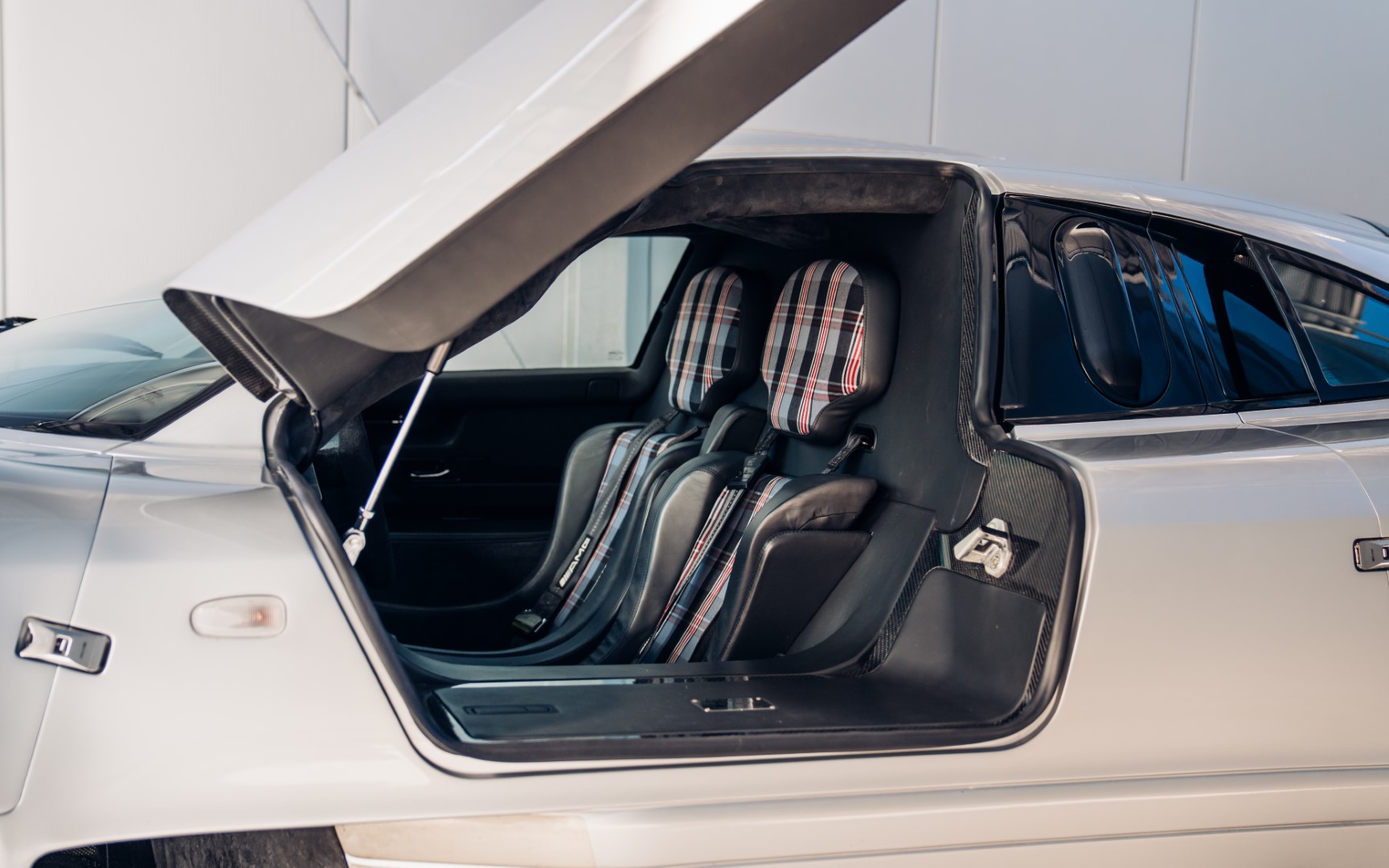 Your article mentions the carbon fibre bodywork, massive air intakes, and the sculpted rear wing, all confirming the car’s identity as a road-legal racing machine. Finished in Mercedes Silver 744, this example remains exceptionally well preserved, with less than 100 km since 1999, a fact that makes its exterior condition unusually close to factory delivery.
